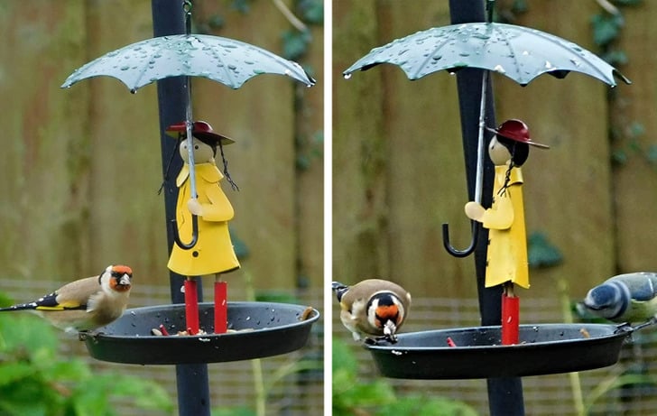 Forecast calling for rain No worries for hungry birds: this little weather girl holds her wide-top umbrella high over a deep basin to keep seed nice and dry. Under her charming slicker and boots are holes that drain unwanted moisture from the dish.